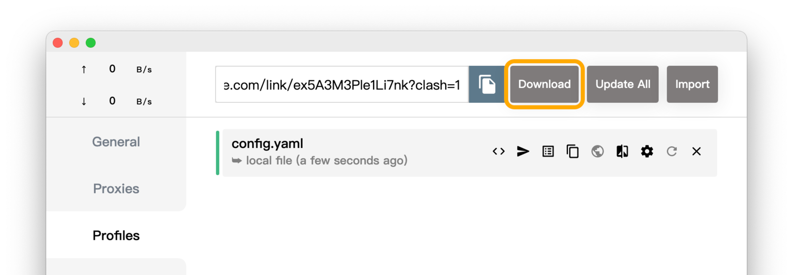 在 Profiles 页面顶部，粘贴 **Clash 配置订阅链接**，随后点击 **Download** 下载配置文件。